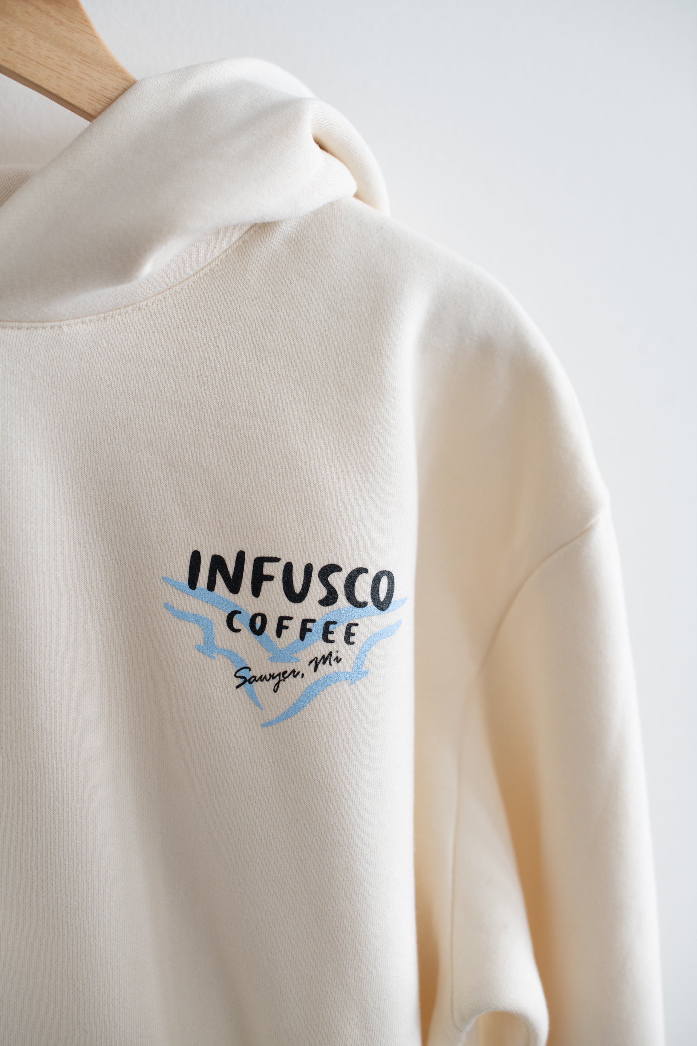 Your new go-to Hoodie - Infusco LOW TIDE in bold on back and Infusco Coffee with Seagull print on front. Constructed from our bestselling 10oz. fleece, weighing in at a robust 330gsm. Featuring an oversized fit, drop shoulder, and no drawcord for a deconstructed modern style. Its streamlined design highlights a single needle stitch at the neckline and pocket for a clean finish.